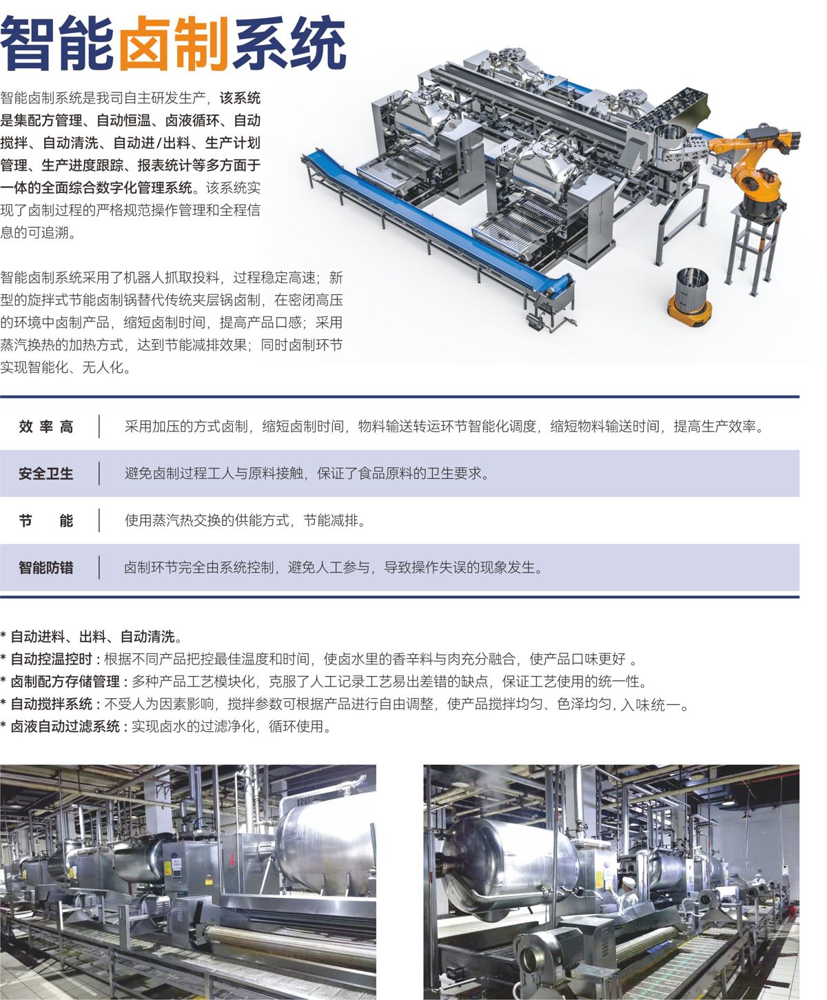 该系统是我司自主研发生产,集配方管理、自动恒温、卤液循环、自动搅拌、自动清洗、自动进/出料、生产计划管理、生产进度跟踪、报表统计等多方面于一体的全面综合数字化管理系统。该系统实现了卤制过程的严格规范操作管理和全程信息的可追溯。